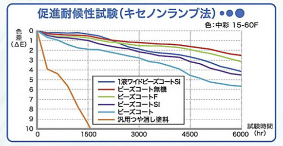 | ビーズコート無機 | 無機 | 5,010円 | 11~15年 | 無機成分を配合した最上位モデルで、ラジカル制御との相乗効果による圧倒的な耐候性と耐久性が特長です。 |