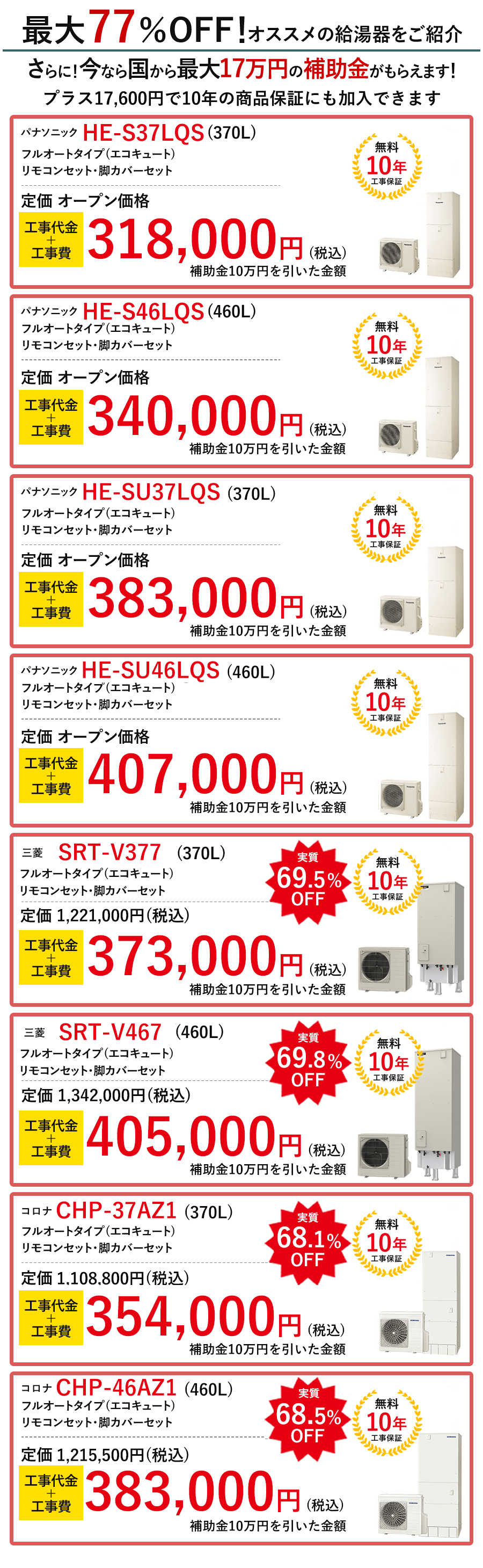 エコキュートはどこで購入しても大手メーカーの同じ商品です。ムダなコストを省くことで、他社よりも安く施工することができます。