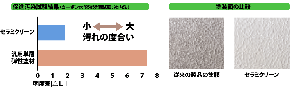 そのため、排気ガスやホコリなどによる汚れが付きにくく、外壁の美観を長期間にわたって保つことができます。この実力は、促進汚染試験の結果でも実証されています。