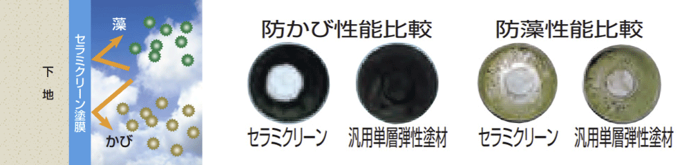 セラミクリーンは、弾性セラミックシリコン樹脂の応用により、従来の塗料に比べて耐久性が高く、弾性機能を持ちながら汚染しにくい塗膜を実現した高耐久・低汚染型の単層弾性塗材です。